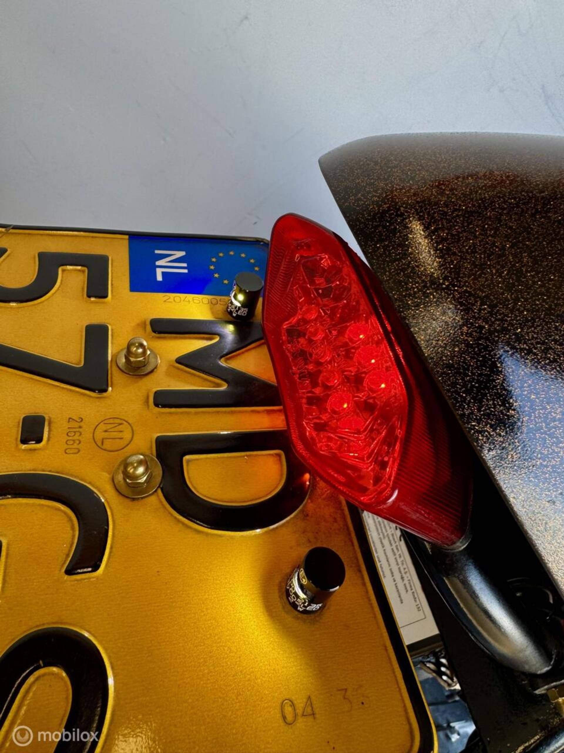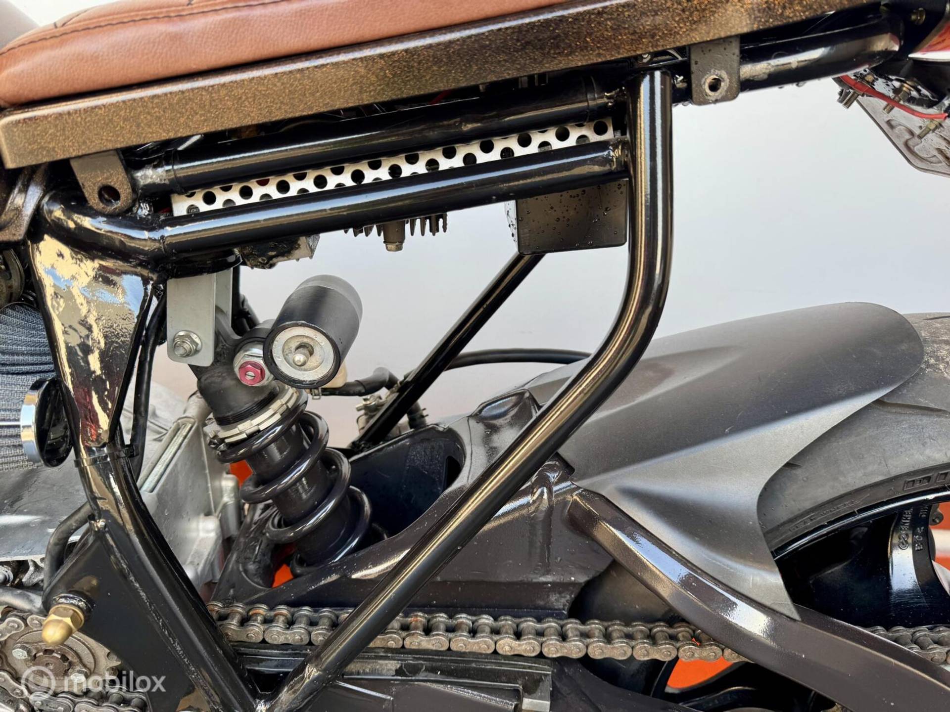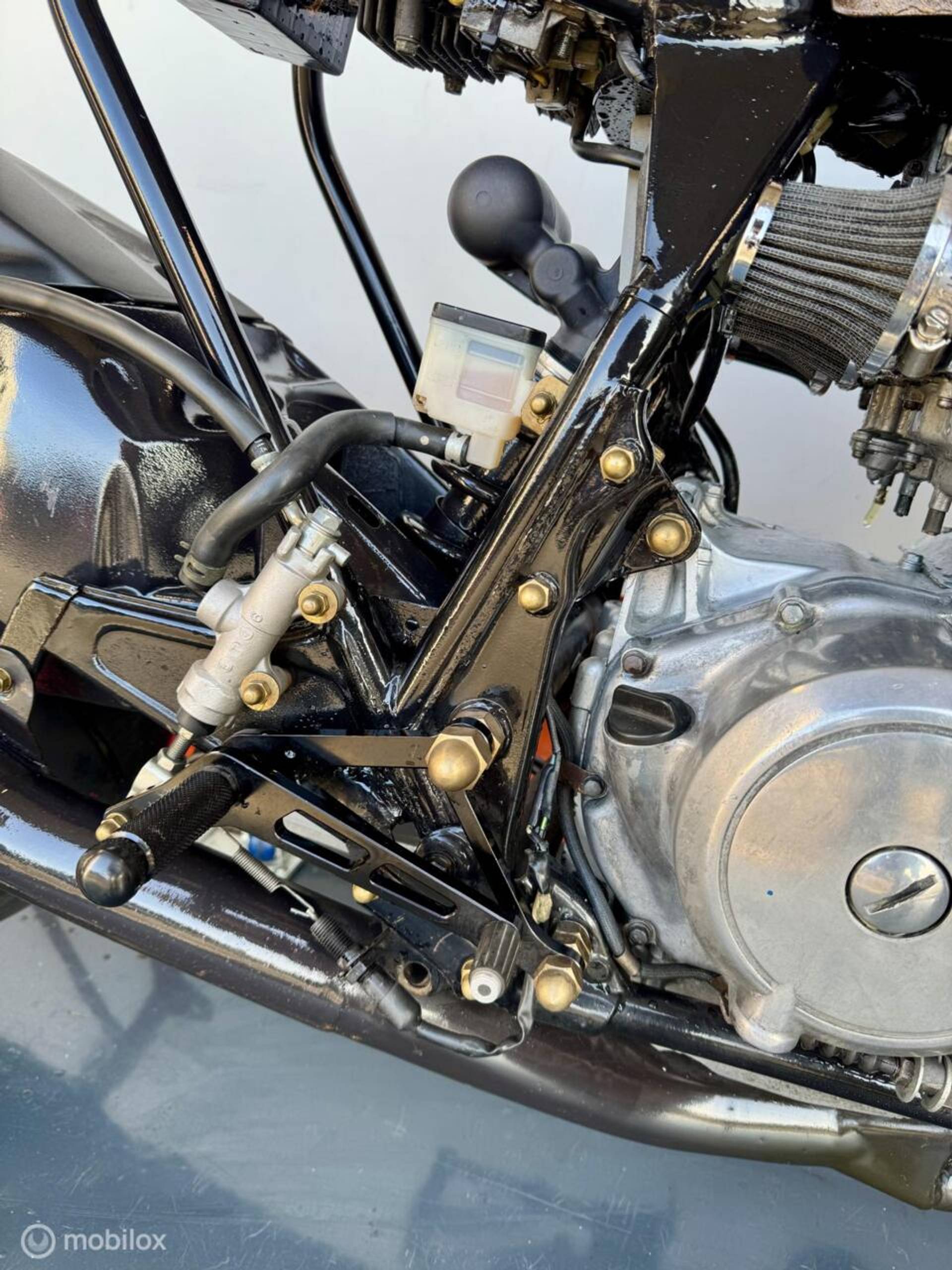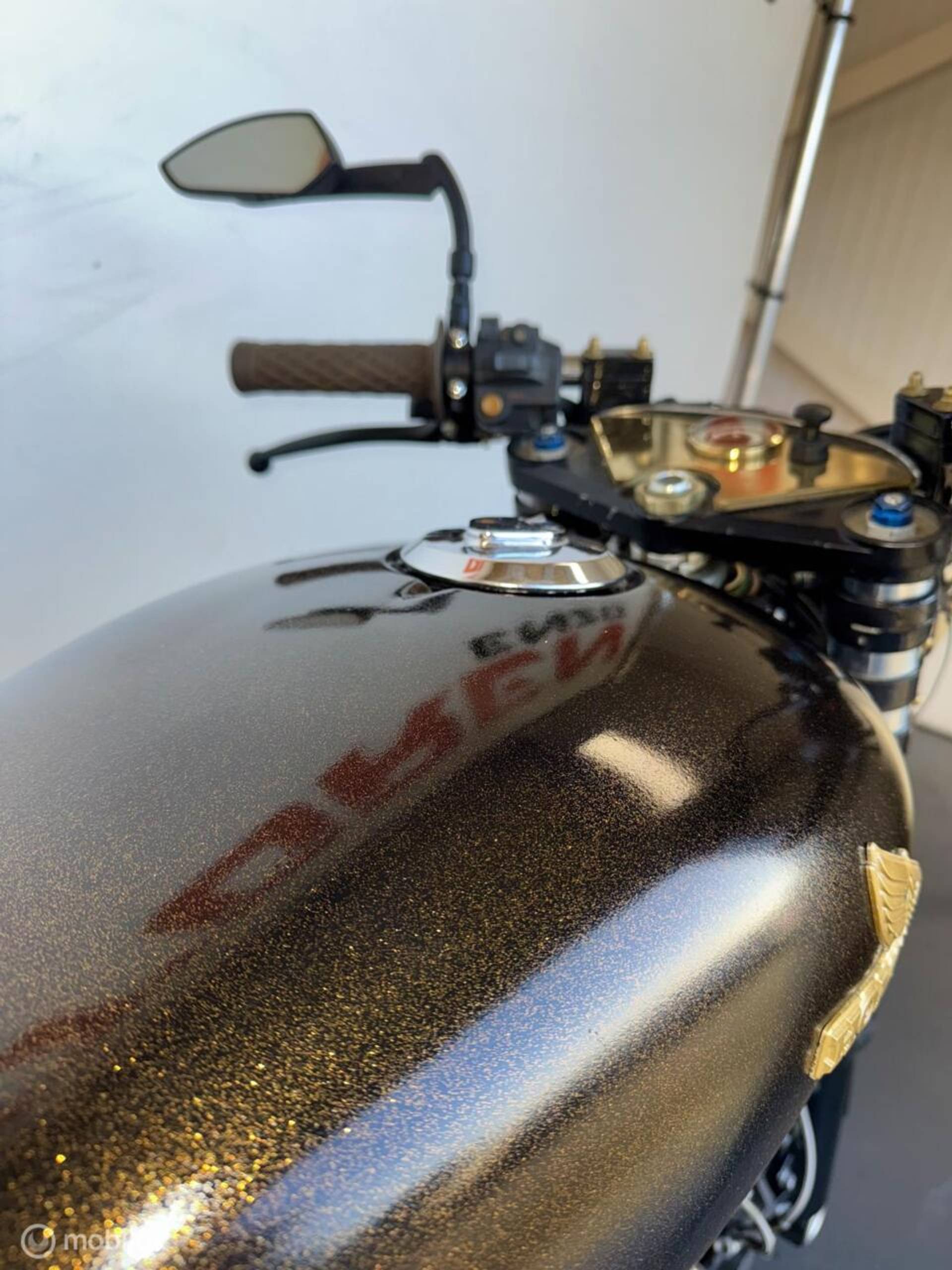 voor en achter met dubbele remschijven voor, en een speciale achterbrug, ook is het hele frame op nieuw gepoedercoat, de motor is voorzien van lakwerk in de kleur midnight gold deze kleur is zwart/bruin met een metalflake gouden afwerking.